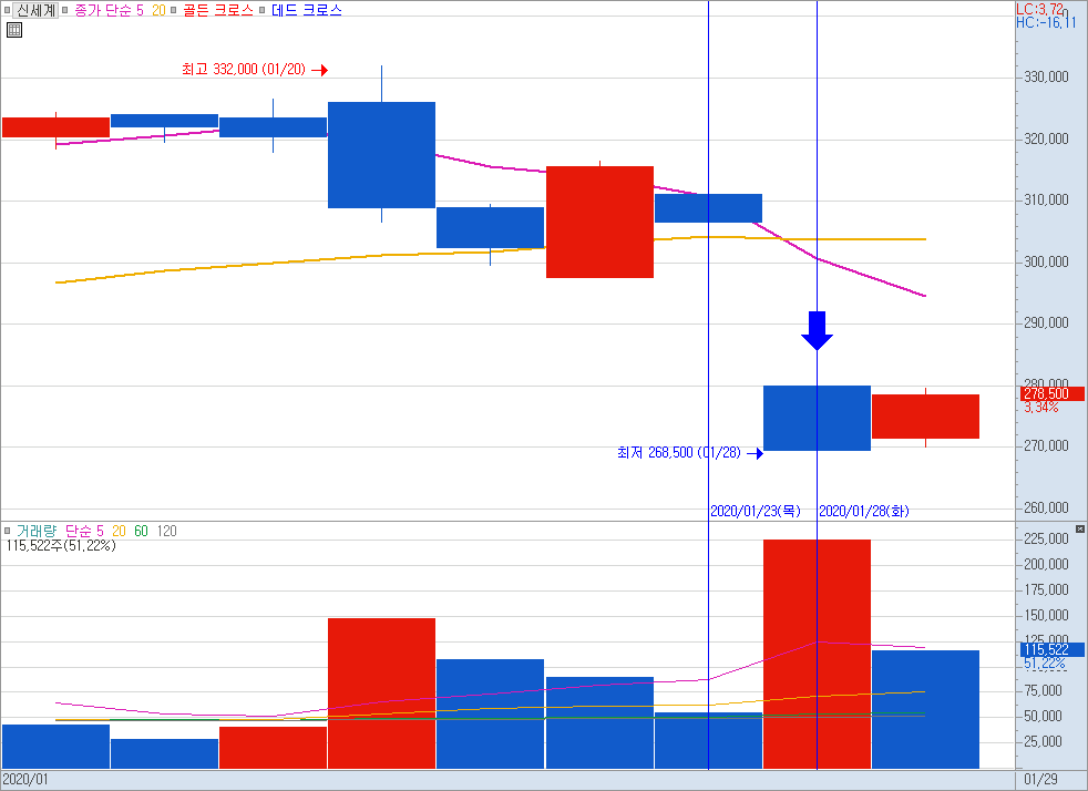 지난 게시글에서 004170(신세계) 종목이 2020년 1월 28일에 매도가 이뤄져야 했음에도 불구하고 매도가 이뤄지지 않았음을 확인할 수 있었다. 따라서 문제를 확인하고자 키움증권 데이터를 확인해보니 2020년 1월 28일은 화요일이었기 때문에 우리가 기존에 제작했던 날짜 계산 함수(cal_subday())는 2020년 1월 27일자의 데이터를 불러오고자 했을 것이다. 하지만 실제 데이터에 따르면 2020년 1월 28일 화요일을 기준으로 하루 전의 데이터는 1월 23일로, 목요일이다. 즉, 금요일과 월요일에는 주가 데이터가 없기 때문에 대소 비교가 불가능해졌고, 그에 따라 매도를 진행하지 못한 것이다.
