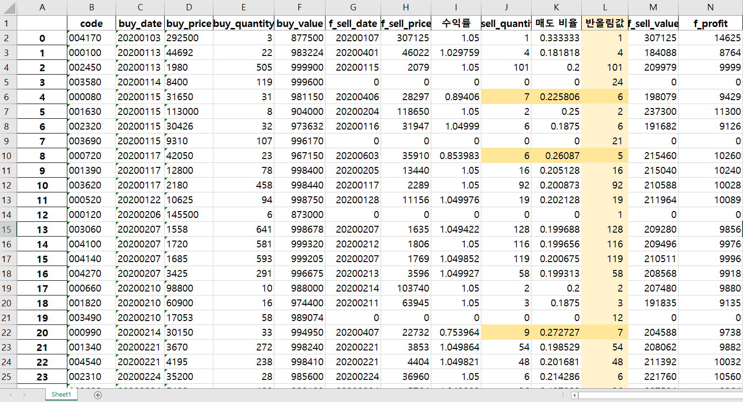 위의 사진에서 반올림값이라고 표시되어 있는 구간(연한 색 배경)은 엑셀 상에서 매수 수량을 기준으로 0.2를 곱한 후 반올림한 결과값이고, 그 왼쪽에 있는 sell_quantity가 파이썬 로직 상에서 계산된 반올림값이다. 연한 노란색보다 조금 진한 색으로 칠해져 있는 구간들을 보면 엑셀 상에서 계산된 값과 파이썬 로직 상에서 계산된 값이 다르다. 네 번째 거래를 보면 31주를 매수했으니 매수 수량인 31에 0.2를 곱했다면 6.2가 나오고 이를 반올림을 하면 6이라는 값이 나오지만, 파이썬에서는 매도 수량으로는 7주가 계산되어 데이터를 입력한 것이다.