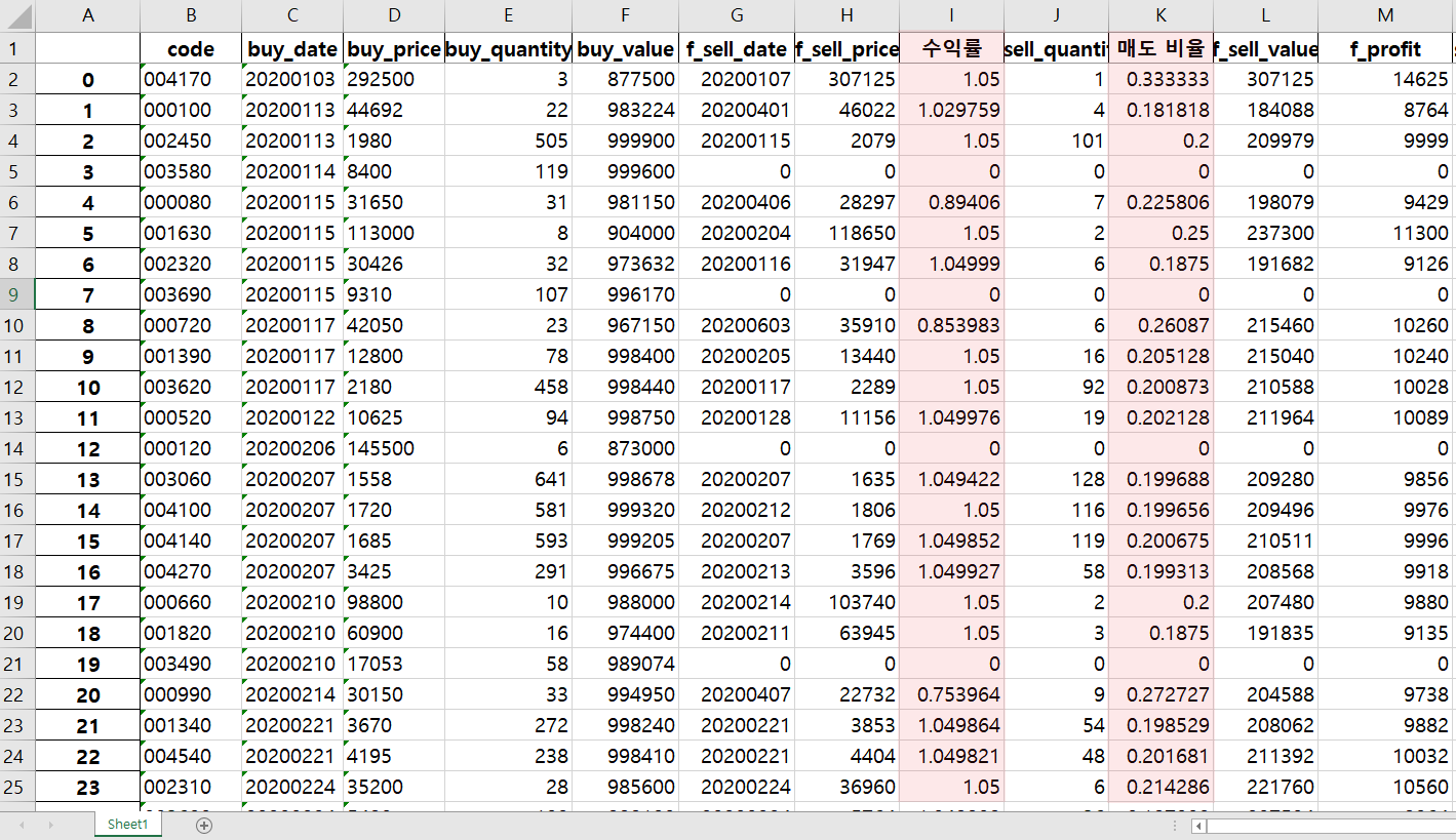 데이터를 보니 수익률이 정확하게 1.05, 즉 5%의 수익률을 거둔 경우가 대부분이긴 하지만 이상하게 0.75 또는 0.85 값이 입력되는 경우들이 있다. 즉, 매수 가격보다 낮은 가격에 매도했음에도 불구하고 수익이 발생한 것이다. 하지만 수익률이 비정상적으로 계산되어 있는 자료들의 공통점이 있다. 바로 매도 수량이 정확하게 계산되지 않았다는 것이다. 아래의 사진을 보도록 하자.