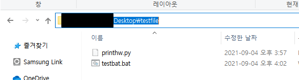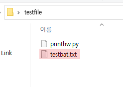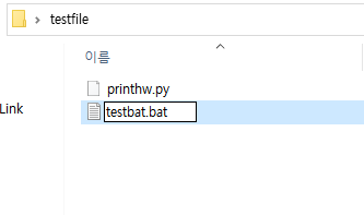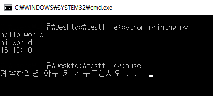 첫 번째 줄에 있는 python printhw.py는 실행하고자 하는 파이썬 파일의 이름이고, 두 번째 줄에 있는 pause는 첫 번째 줄의 명령어를 실행한 이후에는 멈추라는 명령어다. 아래와 같이 입력한 후에 해당 메모장을 저장해주고, 실행하고자 하는 파일인 printhw.py파일과 같은 경로에 두도록 하자.