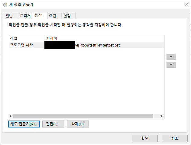 파일 경로를 복사한 후 붙여넣고 확인을 누르면 동작이 생성된 것을 확인할 수 있다.작업 스케줄러가 생성된 모습