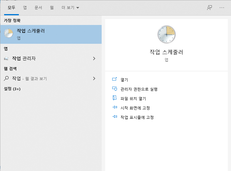 이제 앞에서 bat 파일을 생성했다면, 그 파일을 윈도우 작업 스케쥴러를 통해 작업을 등록해주면 된다. 작업 스케줄러로 진입하는 방법은 윈도우 검색화면에 '작업'이라고 검색하면 아래와 같은 창이 뜨는데, 그걸 클릭해서 들어가도록 하자.