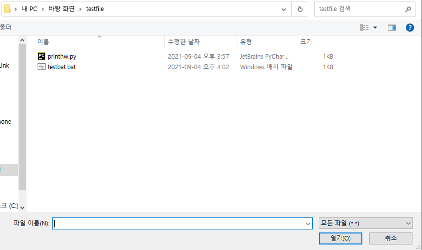 프로그램/스크립트의 오른쪽에 있는 '찾아보기'를 누르면 오른쪽 사진과 같은 화면이 나타나는데, 여기서 testbat.bat을 클릭한 후 '열기'를 클릭