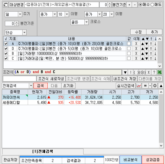 조건식을 자세히 보면 (A or D) and B and C 라고 적혀있는데, 이는 A와 D 둘 중에 하나의 조건이 들어맞는 동시에 B와 C가 충족되는 종목을 찾으라는 의미이다. 이 조건 하에 검색된 종목은 까뮤이앤씨[013700] 와 세종메디칼[258830] 두 종목이다. 이제 이 데이터를 가지고 조건검색식을 조회했을 때 두 종목의 종목 코드를 제대로 가져오는지 한 번 살펴보도록 하자.