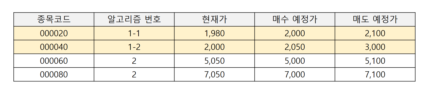 왼쪽의 로직은 해당 종목이 계산된 근거가 몇 번 알고리즘인가를 먼저 판단한 후에 거래를 진행할 수 있는가 없는가를 구분해내는 것이고, 두 번째 로직은 먼저 계산할 수 있는가 없는가를 판단한 후에 어떤 알고리즘에 의해 계산된 것인지를 구분해내는 것이다. 어떤 로직이 거래를 진행하기에 불필요한 작업을 수행하지 않는가? 당연 두 번째 로직이다. 왜냐하면 거래를 진행하지 않는 것에 대한 데이터 계산을 하지 않기 때문이다. 아래의 데이터를 살펴보자