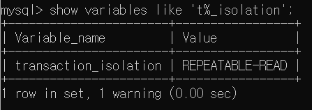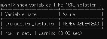 그 후에 다시 MySQL 8.0 Command Line Client를 열어서 show variables like 't&_isolation';을 사용하면, 아래와 같이 트랜잭션이 정상적으로 추가된 모습을 확인할 수 있다.