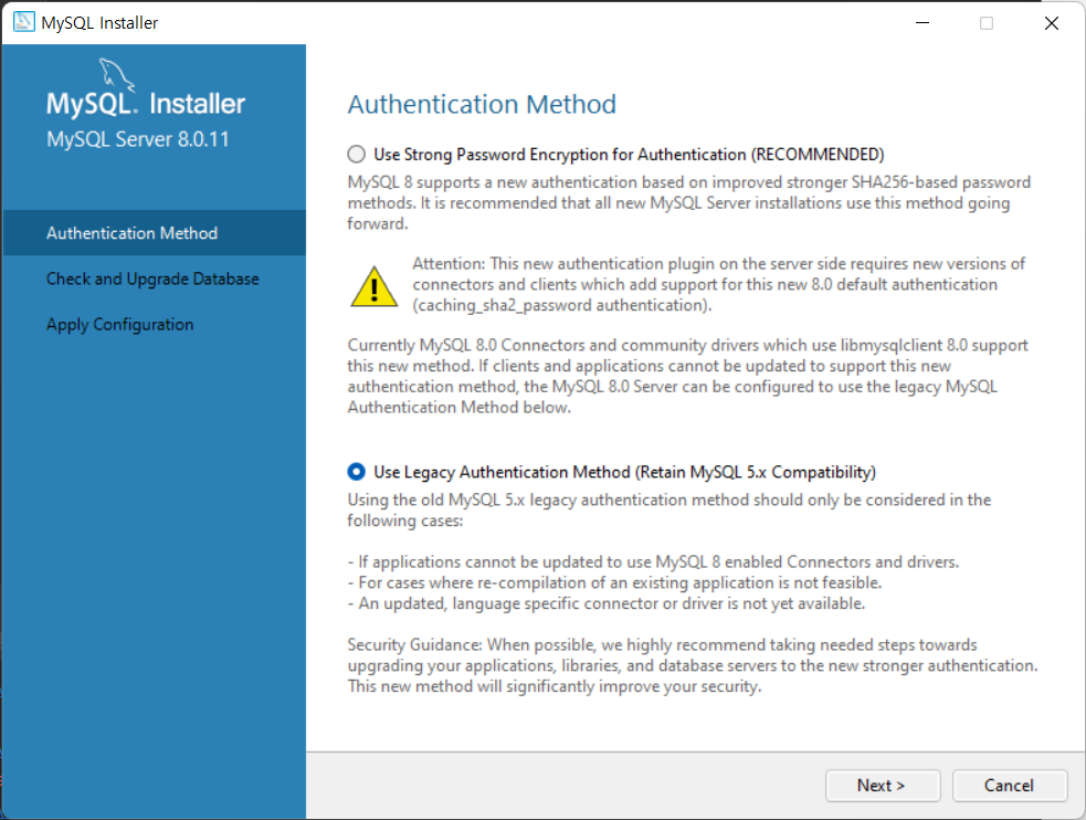 그렇다. 아래와 같이 Authentication Method라는 창이 떠야 정상이다. 왠지 이번에 설치할 땐 이 창을 못 봐서, 설치 과정에서 "아 뭔가 좀 이상한데?"싶었지만 원인을 찾을 수는 없었다.