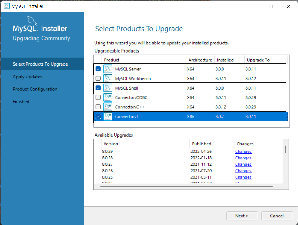 일단 본인의 경우에는 MySQL을 최신 버전으로 사용하는 것을 원하지 않기 때문에(오류의 발생 가능성이 높은 특성), 가능한 한 최대한 낮은 버전의 프로그램을 사용하는 것을 추구하는 입장이다. 그래서 생각보다 너무 낮은 버전의 프로그램이 설치되어 있는 것은 아니었을까 싶은 생각에 MySQL Installer를 다시 한 번 뒤적였다.