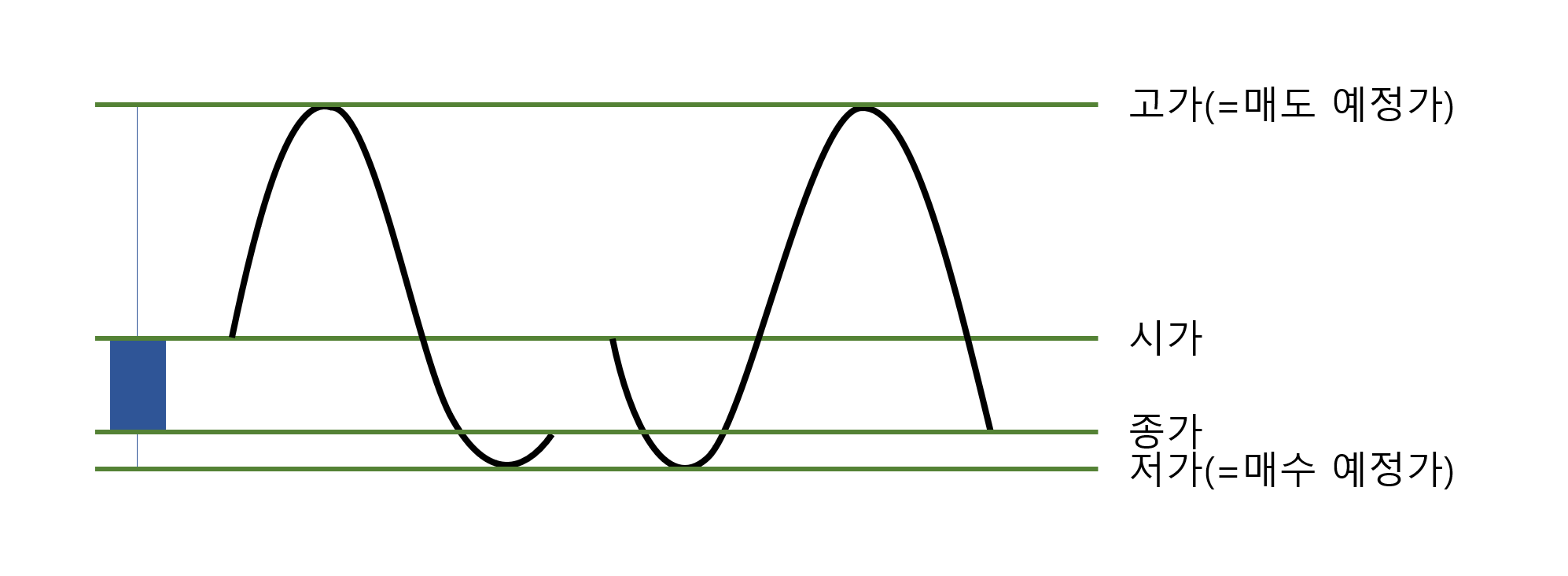 백테스트 과정에서, 백테스트 알고리즘은 위의 흐름에 대해 다음과 같은 판단을 내릴 것이다. 저가는 매수 예정가에 닿았으니 매수를 진행하고, 고가는 매도 예정가에 닿았으니 매도를 진행하게 된다. 즉, 당일에 매수한 후에 당일에 매도한다는 것이다. 다시 말해, 실제 주가의 흐름이 오른쪽과 같았다면 문제가 없었겠지만 왼쪽의 흐름이었다면 실제로는 매수도 매도도 이루어지지 못하는 주가 흐름이었기 때문에, 백테스트 코드는 정상적으로 동작하지 않는다는 것이다.