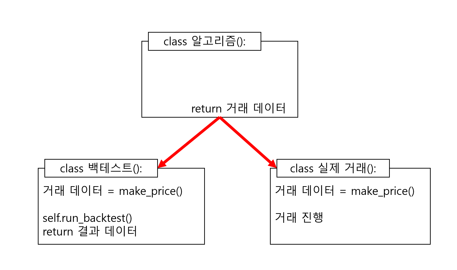 위와 같이 특정 알고리즘은 매수가와 매도가만 산출하는 형태의 알고리즘을 갖춰야 한다. 즉, 알고리즘에서는 매수가와 매도가만 계산하는 역할을 수행하므로 백테스트 클래스 에서는 일봉 데이터가 있다고 할 때 특정 시점까지의 일봉 데이터만을 알고리즘에 전송해준 후에, 전달받은 거래 데이터 를 기반으로 이후의 데이터에 적용하여 백테스트를 진행하면 되고, 실제 거래 클래스 에서는 딱히 나누어줄 시점이랄 게 없으니 그냥 서버로부터 전달받은 일봉 데이터 전부틑 전달해서 거래 데이터 를 얻어와 그 데이터를 기반으로 거래를 진행하면 되는 것이다.