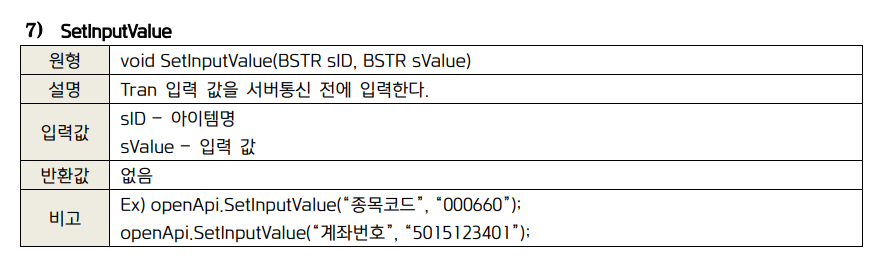 키움증권 개발가이드 내 SetInputValue에 대한 설명 및 사용 예시
