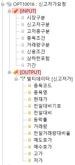 이제 이 내용을 바탕으로 OPT10016 : 신고저가요청의 데이터를 요청하는 CommRqData 부분을 제작해보도록 하자.