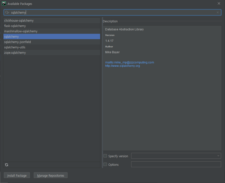 위의 검색 화면에 sqlalchemy와 mysql을 검색한 후에 각각 하나씩 설치를 해주면 된다. 설치 버튼은 하단 가장 좌측에 위치한 install package를 클릭하면 알아서 설치를 시작한다.