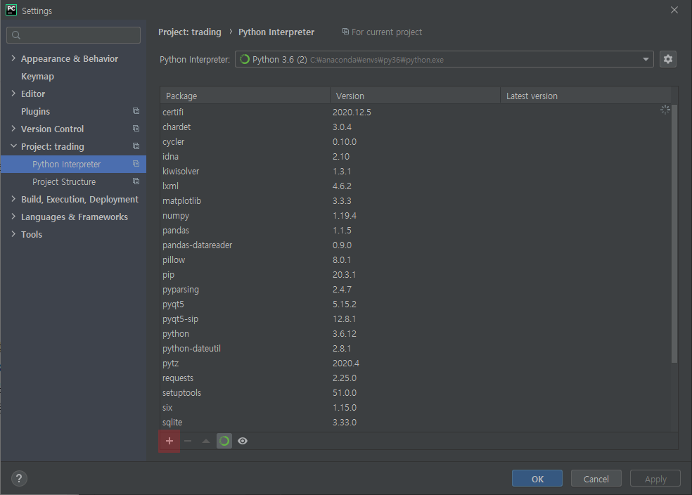 먼저 파이참에서 왼쪽 상단의 [File] - [Settings] 메뉴를 클릭하면 창 하나가 뜨는데, 그 창에서 Project: 아래에 있는 Python interpreter를 클릭하자. 그러면 위의 오른쪽에 있는 사진과 같은 화면이 나오게 되는데, 하단 좌측에 있는 + 버튼을 클릭하자.