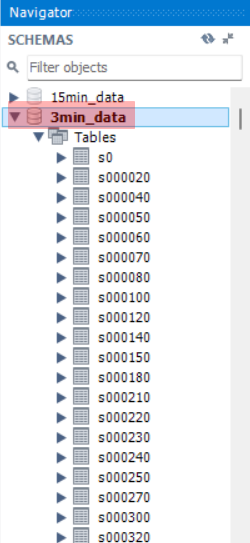 WorkBench 사용 방법에 대해서는 별도로 언급하지 않았었는데, 여기서 간략하게 설명해보도록 하겠다. 일단 가장 먼저 사용하고자 하는 데이터베이스를 활성화시켜야 한다. 아래 사진을 보면 3min_data가 굵은 글씨로 되어 있는데 그것이 바로 활성화된 상태라는 것을 의미한다. 활성화된 상태와 활성화되지 않은 상태에서 사용해야 하는 방법은 각각 다른데, 아래의 코드를 보면 어렵지 않게 이해할 수 있다.