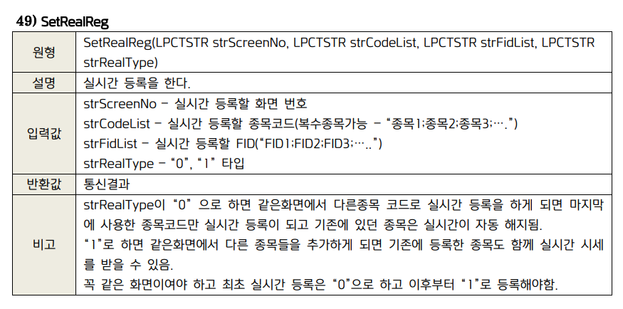 실시간 등록 함수 제작하기 : SetRealReg