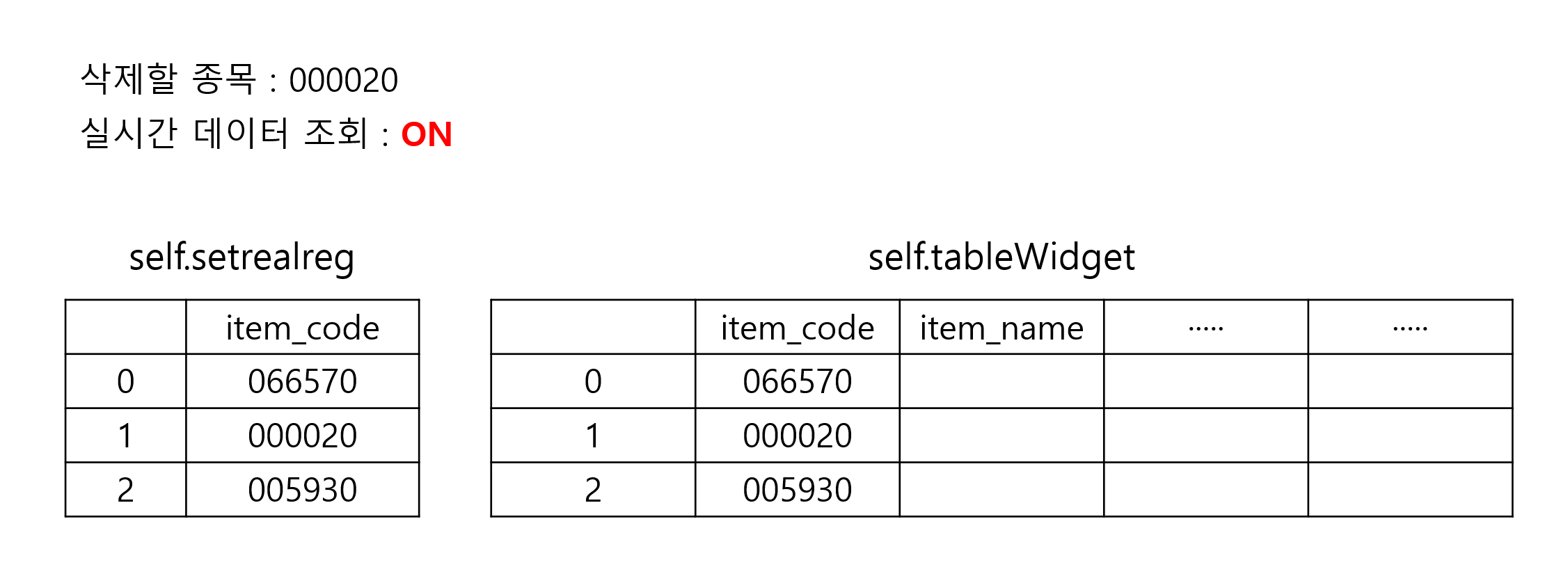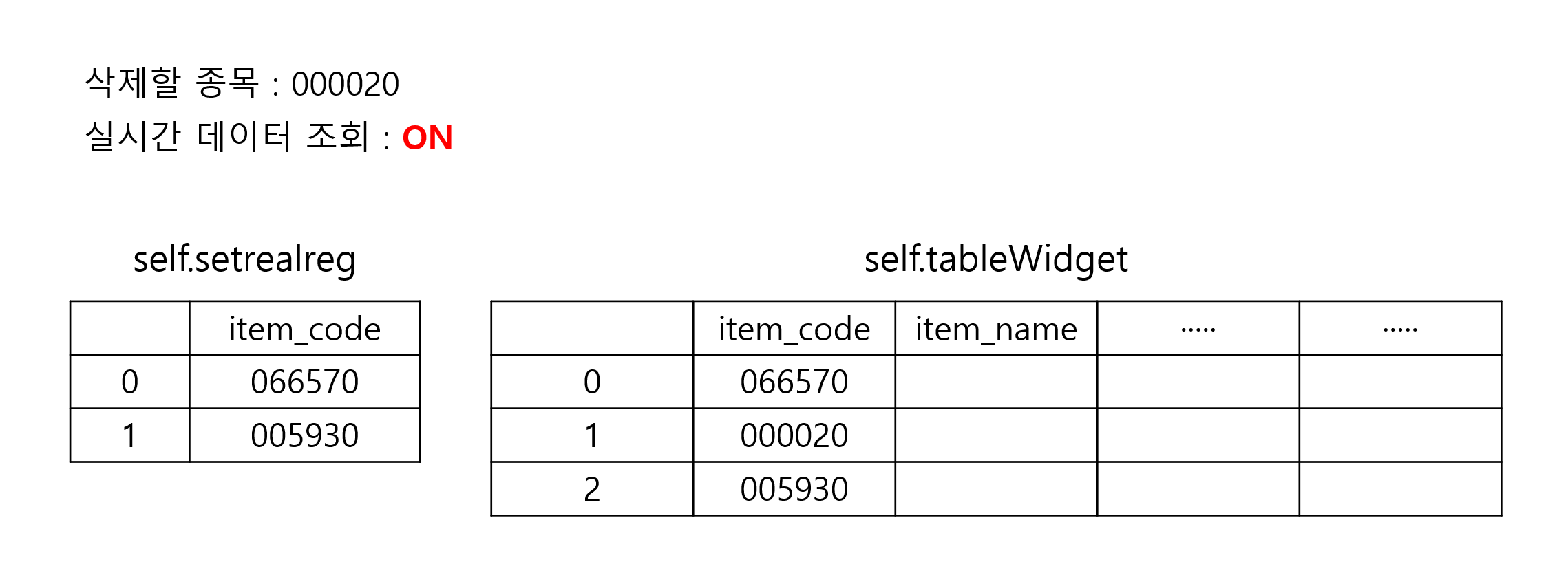 현재 self.setrealreg 변수와 tableWIdget의 상태는 아래의 이미지와 같은 상태라고 가정하고, 실시간으로 등록되어 있는 세 개의 종목 중 "000020" 종목에 대한 실시간을 해제한다고 가정하고 한 단계씩 그 변화를 살펴보도록 하자.