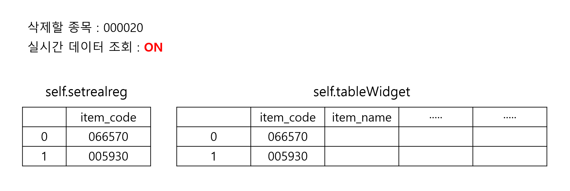 사실 self.setrealreg 변수 내에서 데이터를 삭제하는 건 간단했지만, tableWidget을 수정하는 것은 별도의 게시글로 분리한 이유가 있다. 바로 데이터프레임 내에서 데이터를 삭제하는 것처럼 간단하지가 않기 때문이다. 아니, 간단하지 않다기 보다는 코드는 간단하지만, 그 개념을 이해하는 것이 조금 어려울 수도 있다. (쉽게 느껴진다면 다행이다.)