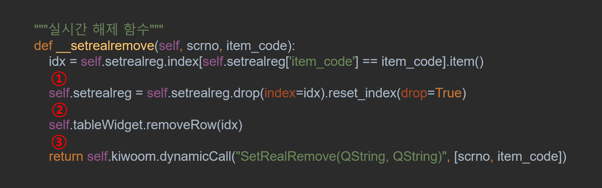 우리는 실시간 해제 시에 반드시 눈 여겨봐야 하는 것이 있다. 바로 코드의 순서인데, 이 코드의 순서를 왜 살펴봐야 하는지에 대해 생각해봐야 한다. 예전에 실시간 데이터가 발생하는 동시에 tableWIdget에 데이터를 입력하도록 하는 기능을 구현하는 게시글 내에서 ValueError 와 UnboundLocalError 라는 두 가지 오류를 처리해줬던 것이 기억나는가?