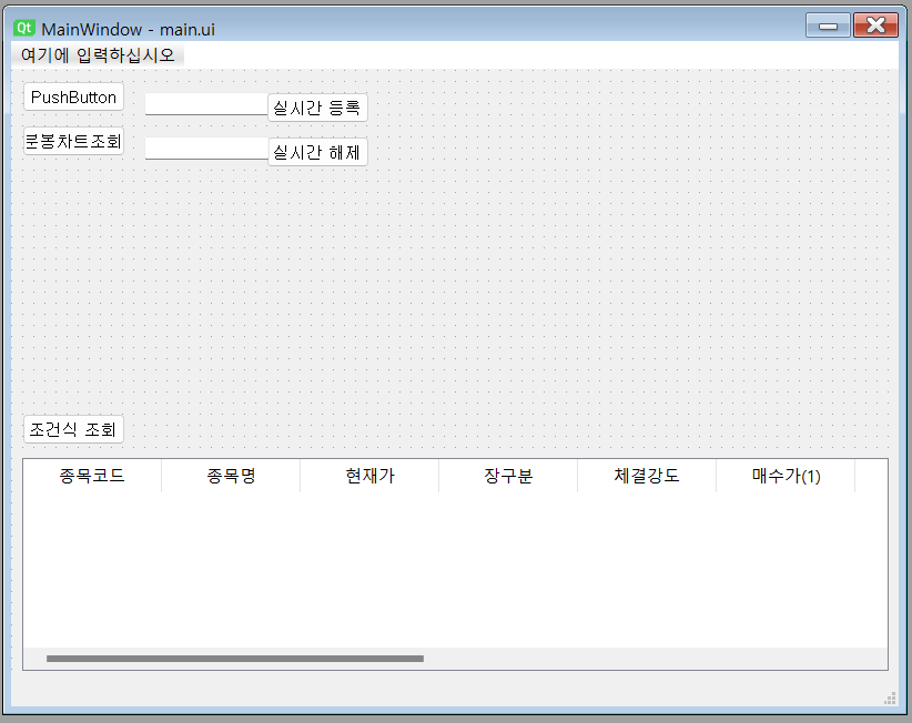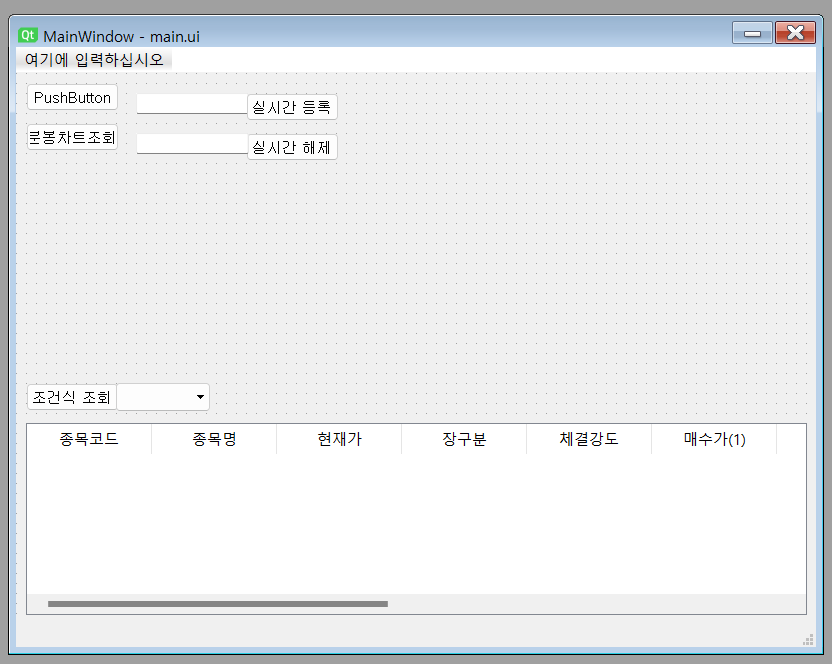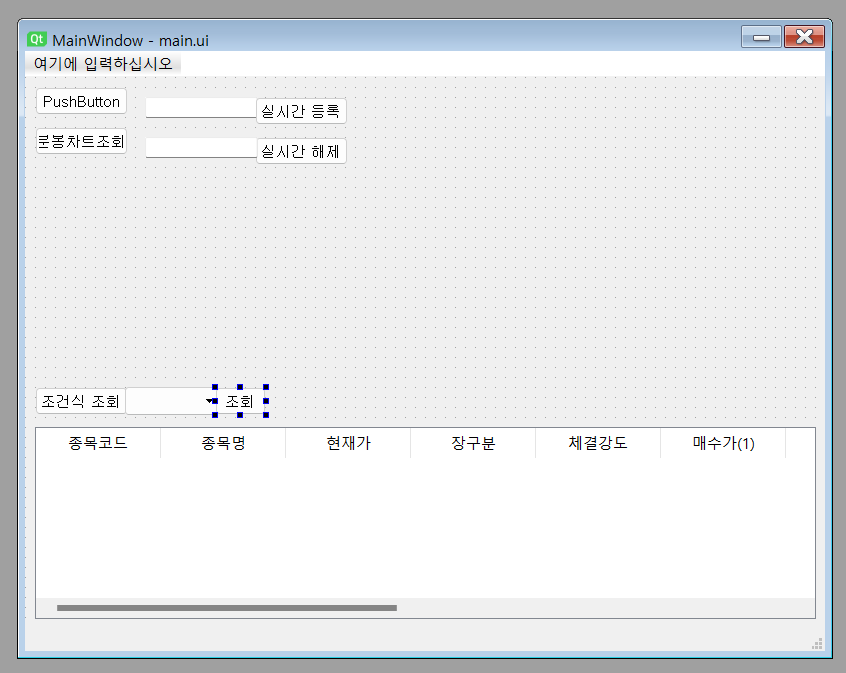 아직 조건검색식을 사용할 수 있도록 하는 버튼이 존재하지 않는다. GUI 상에서 여러 기능들을 사용할 예정인데, 콤보 박스와 같은 전에는 사용하지 않았던 기능들이 추가될 예정이니 잘 따라오도록 하자. 가장 먼저 구현할 버튼은 서버로부터 조건검색식과 관련된 데이터를 시스템 내에 저장하는 def __getconditionload(self) 를 실행할 버튼이다.