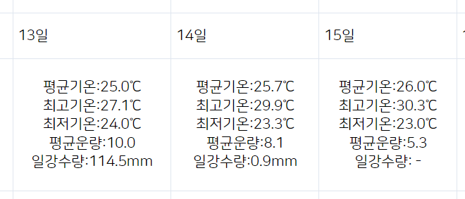 아래 사진 상에서 보면 7월 13일에 일 강수량이 114.5mm로 엄청나게 많이 왔음. 이번에 서울에 물바다가 생기면서 온갖 지하가 침수됐던 8월의 폭우는 8일부터 9일까지 이틀 간 발생한 폭우였는데, 이 때 일 강수량이 129.6mm와 123.1mm로 평균 126.35mm의 강수랼이 발생했었음. 서울이 물바다가 된 게 126.35mm였으니 114.5mm면 어느 정돈지 대충 감은 오실 것임.