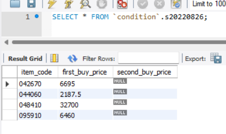 이제 프로그램을 다시 실행해서 조건검색식에 의한 데이터를 조회해보면, 아래와 같은 테이블이 생성된 모습을 확인할 수 있다.
