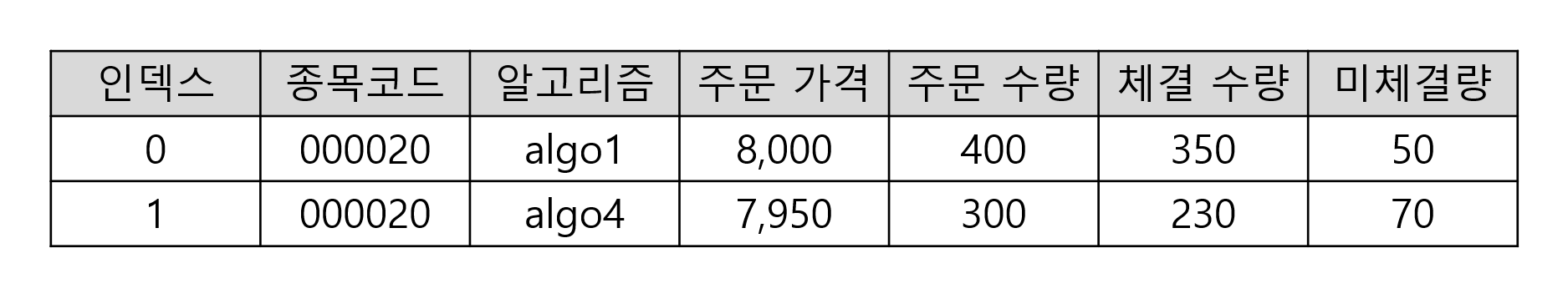 위의 경우에 대해 이해하기가 조금 어려울 수도 있겠지만, 해당 종목의 호가가 얇고 두 개의 알고리즘에 의해 계산된 가격이 있는 경우를 생각하면 한결 이해하기가 쉬울 것이다. 즉, algorithm1에 의해 8,000원이라는 가격에 400주를 매수하는 주문을 접수했으나 주가가 하락하면서 7,950원까지 하락했고, 해당 가격에서는 algorithm4에 의해 7,950원이라는 가격에 300주를 매수하는 주문이 접수됨에 따라 두 개의 가격대에 주문이 접수되어 있는 경우인 것이다.