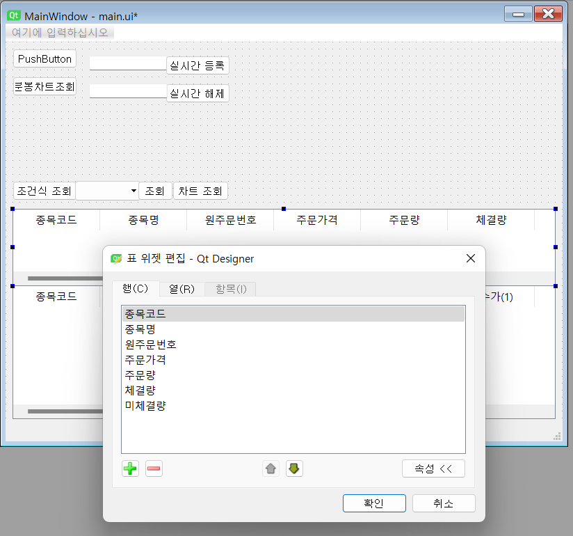 앞서 실시간으로 등록한 종목들을 대상으로 tableWidget에 데이터를 추가하는 방법을 살펴봤었는데, 여기서 구현할 기능 역시 그 때 당시에 사용했던 방법과 동일한 로직으로 진행할 예정이다. GUI 파일 내에 tableWidget을 생성하고, 그를 self.order_info 변수와 연동시켜 동작하도록 할 것이다. 일단, GUI에 tableWidget부터 생성해보자. tableWidget의 행이 되는 칼럼으로는 종목코드, 종목명, 원주문번호, 주문가격, 주문량, 체결량, 미체결량의 7개이다.