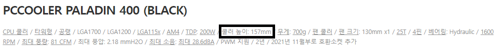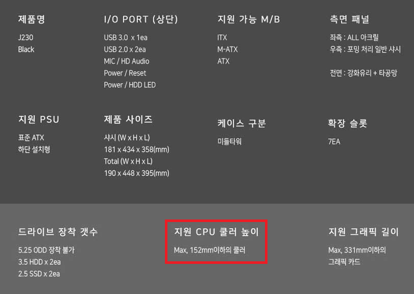 그리고 공랭 쿨러의 경우에는 어지간한 제품들은 설치 규격이 명시되어 있음. 나는 어떻게든 컴퓨터 조립 비용을 줄여보겠다고 기존 케이스의 폭을 생각지 않고 구매했는데, 막상 조립해놓고 보니 쿨러가 케이스 바깥으로 튀어나와 기존 케이스의 옆 뚜껑이 닫히지 않는 불상사가 일어남. (쿠팡 로켓배송으로 케이스를 또 구매했음.)