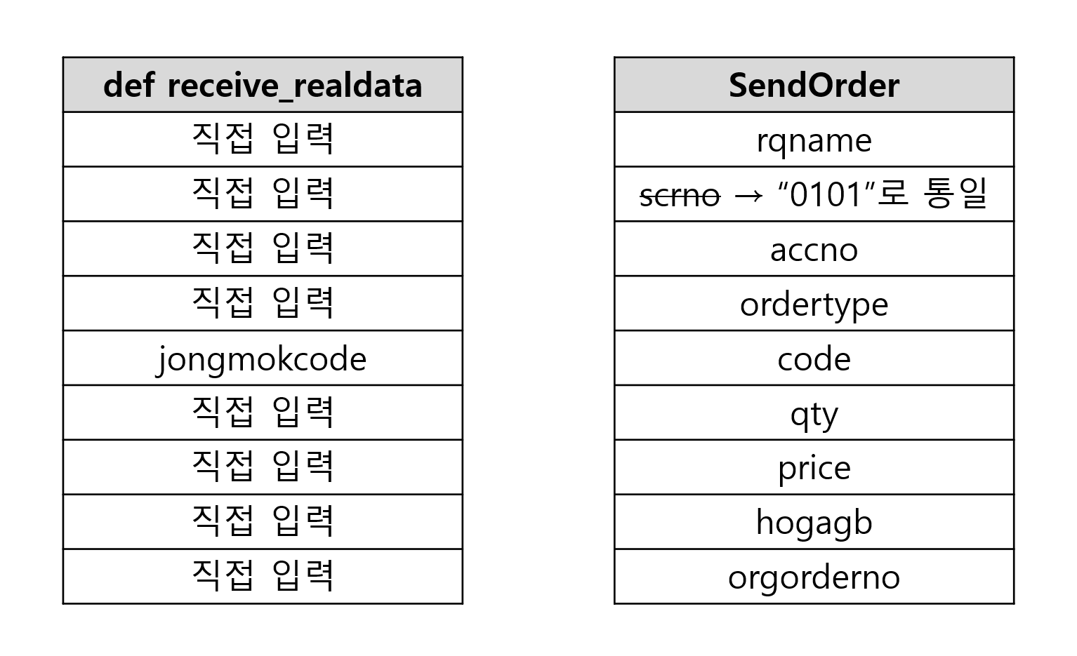 아래의 도표를 확인해보자. 우리가 SendOrder 로 전달해야 하는 데이터와 서버로부터 전달받는 실시간 데이터 간에는 다음과 같은 관계가 성립하고 있다.
