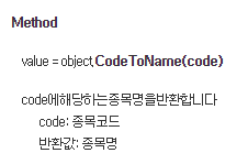 이 모듈에서 가장 먼저 확인할 수 있는 함수는 바로 `CodeToName(Code)`이다. 이는 `CodeToName`이라는 함수의 인자로 전달된 변수인 `Code`의 종목명을 반환하는 함수인데, 앞에서 사용했던 모듈과는 다른 부분이 있다면 함수에 대해 설명하는 내용에 있는 Object 란에 `self.cybos`가 아닌 `self.stockcode`가 들어가야 한다는 것이다.