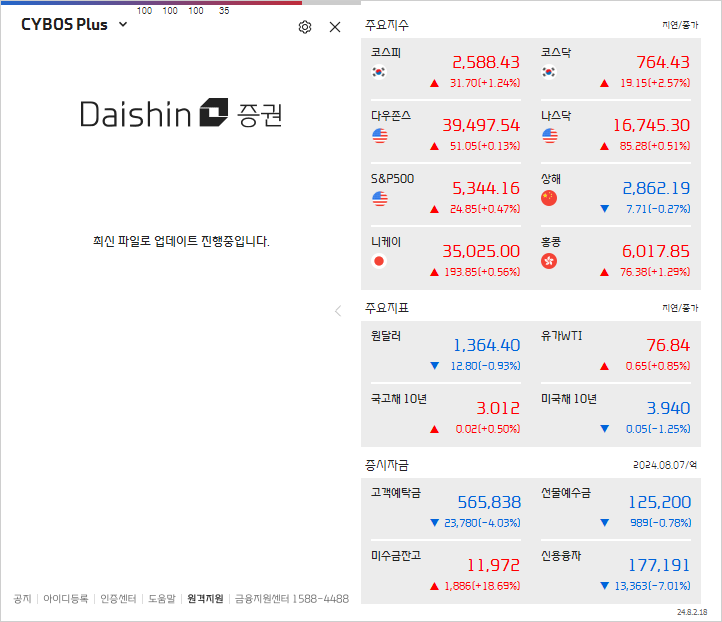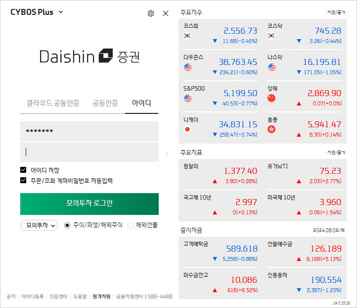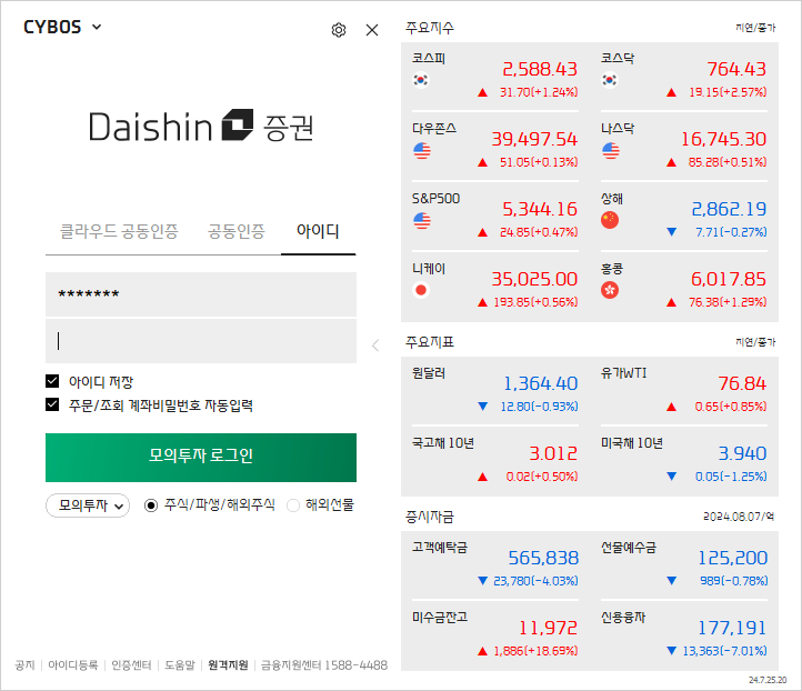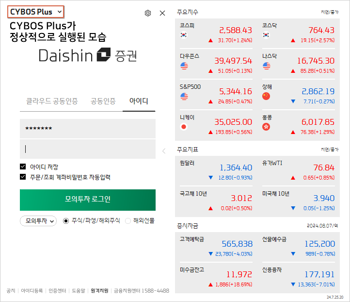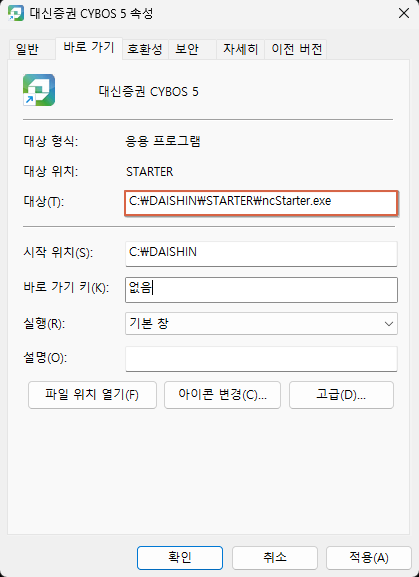 경로를 확인해보니 대신증권 CYBOS 5는 C:\DAISHIN\STARTER\ncStarter.exe를 실행하는 바로가기 아이콘이고, Cybos Plus 아이콘은 동일한 실행 파일을 실행시키지만 그 실행 옵션으로 `/prj:cp`를 전달하여 실행하고 있음을 확인할 수 있다. 그렇다면 일단 프로그램이 실행될 경로는 확인하였으니, 아래와 같이 코드를 구현해보도록 하자. 그럼 대신증권 CYBOS 5가 아래와 같이 실행될 것이다.