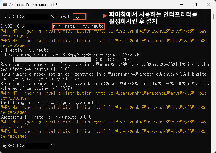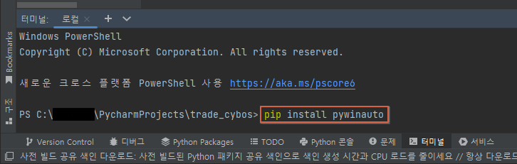그렇다면 그 방법은 무엇일까? 바로 `pywinauto` 모듈이다. 우리는 파이썬을 통해 윈도우 프로그램을 실행시키고 관련 데이터들을 입력시킬 수 있는 `pywinauto` 모듈을 활용해서 자동으로 CYBOS PLUS를 실행시키고 로그인할 수 있다. 이전에도 대신증권 모듈에 대한 인스턴스를 생성할 때 `import win32com.client`를 통해 불러온 모듈의 `Dispatch()` 함수를 통해 인스턴스를 생성했던 것처럼, 이번에도 `import pywinauto`를 통해 불러온 모듈을 가지고 CYBOS PLUS를 자동으로 실행시킬 수 있다. 만약 `pywinauto` 모듈이 설치되어 있지 않다면 아래와 같이 빨간색 밑줄이 그어질텐데, 이 모듈을 이전에 설치했던 방식과는 다른 방식으로 설치해주어야 한다. 아래의 이미지와 같이 파이참 하단의 Terminal 내에서 아래와 같은 코드를 입력한 후 엔터를 쳐서 바로 설치하면 된다. (만약 아나콘다와 같은 가상환경에서 생성한 파이썬 버전을 파이참의 인터프리터로 활용하고 있는 경우에는, 아나콘다 프롬프트에서 아래 코드를 입력해서 따로 설치해줘야 사용이 가능하다.)