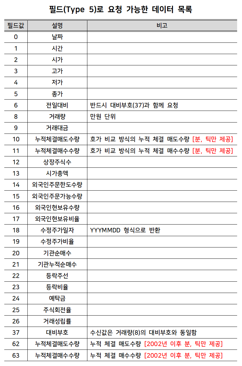 이외에도 `Type 5`의 경우에는 회신받고자 하는 데이터를 하나의 리스트 형태로 전달해주어야 하는데, 그 내용은 아래의 표를 따른다. 자세한 내용은 아래의 표를 참고하도록 하고, 이번 게시글에서는 날짜(0), 시가(2), 고가(3), 저가(4), 종가(5), 전일 대비(6), 거래량(8), 거래대금(9), 대비 부호(37)에 대해서만 요청하도록 하자. `Type 5` 데이터는 인자로 전달받아도 되고 전달받지 않아도 되는데, 기본적으로 특정 일자 범위를 기준으로 조회하는 것은 대체로 필요한 데이터 타입은 거의 일정하기 때문에 본인의 경우에는 인자로 전달받지 않고 함수 내부에서 데이터의 배열을 직접 전달해줄 예정이다.