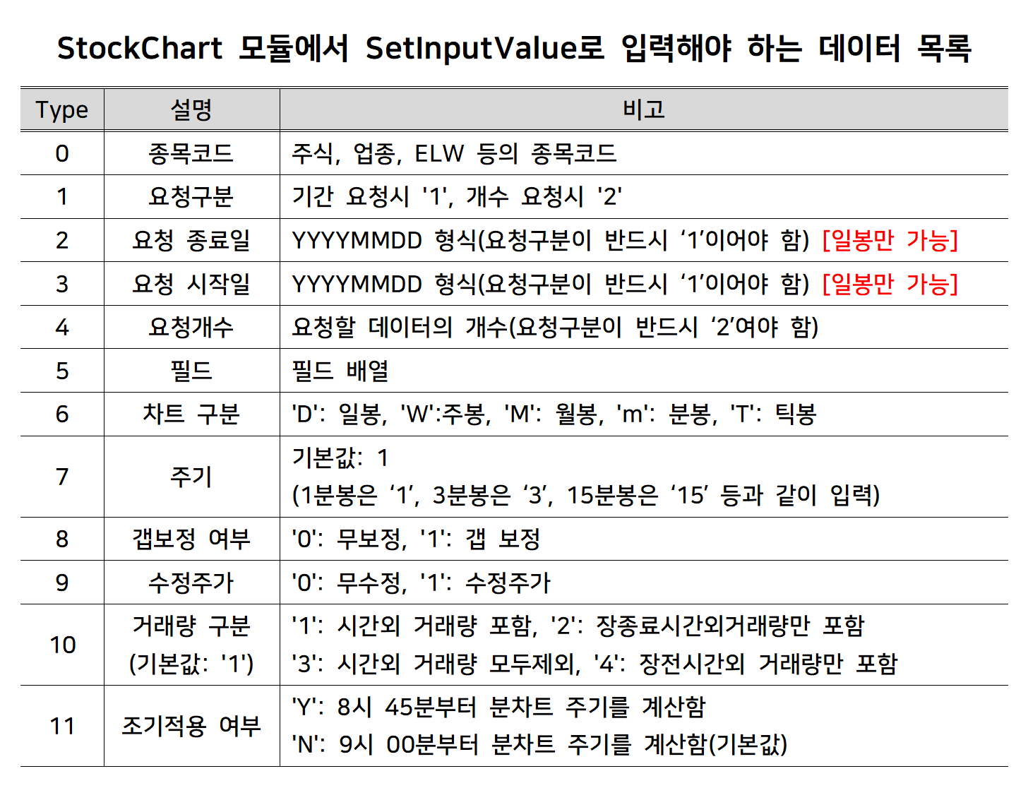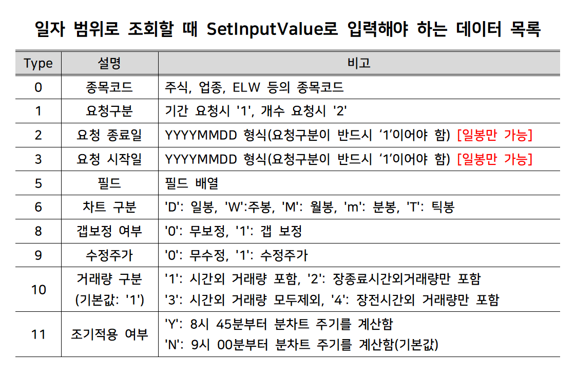 이 목차에서 구현하고자 하는 함수는 말 그대로 '요청 시작일'과 '요청 종료일'이라는 두 개의 데이터를 함께 전달하여 시작일부터 종료일까지에 해당하는 기간에 해당하는 일봉 차트 데이터를 조회하는 함수이다. 일자 범위를 전달하여 차트 데이터를 조회하는 함수는 기본적으로 '일봉 차트 데이터'만 조회가 가능하다. 이는 프로그램 구현의 한계가 아니라 대신증권 Open API에서 그렇게 제공하고 있으니 참고하도록 하자. 이 모듈에서 데이터를 요청할 때 서버로 전달해주어야 하는 데이터 목록은 아래와 같다.