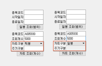 프로그램 실행 전에 앞서, 일봉 차트를 조회하는 함수는 `def chart_DWM`으로 바꾸었고 분봉 차트를 조회하는 함수의 이름은 `def chart_MT`로 새롭게 생성한 만큼 Boss.py 파일에 있는 코드를 조금 수정해주어야 한다. 이전에 `comboBox_2`의 `currentIndex()`를 활용하여 콤보박스의 활성화되어 있는 데이터가 틱봉이면 "T", 분봉이면 "m", 일봉이면 "D"와 같은 데이터를 `request` 변수에 입력하도록 해주었다. 따라서 우리는 콤보박스의 `currentIndex()`값이 틱봉·분봉을 뜻하는 0과 1인 경우에는 `chart_MT`를 실행시키도록 하고 일봉·주봉·월봉을 뜻하는 2, 3, 4인 경우에는 `chart_DWM`을 실행시키도록 해주어야 한다.