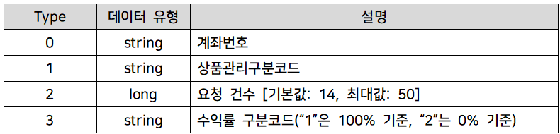 2: (long)요청건수[기본값:14, 최대 50], 3: (str)수익률구분코드("1"은 100% 기준, "2"는 0% 기준)