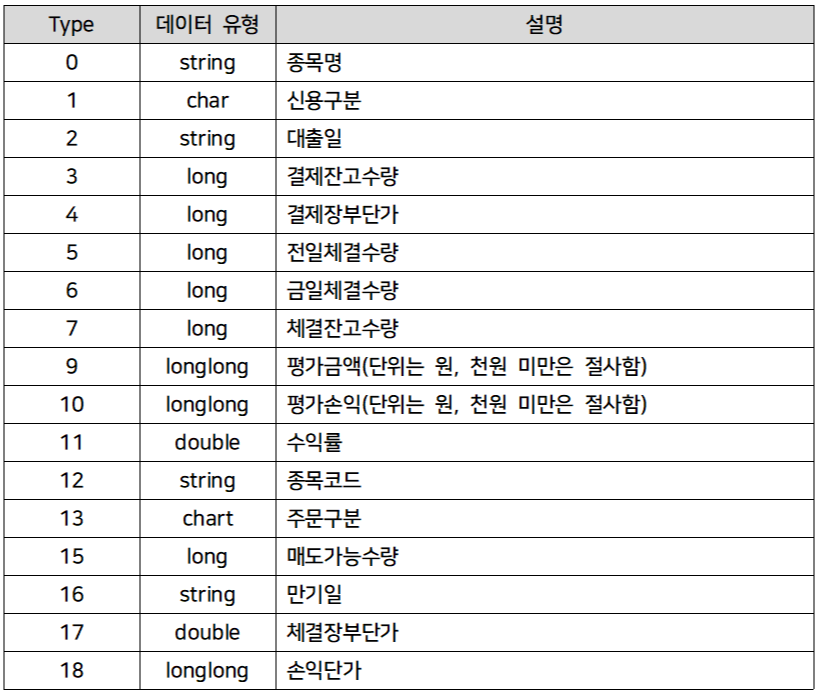 이제 서버에 데이터를 요청하는 과정까지는 모두 진행시켰으니, 이제 서버로부터 각각의 `Type`에 해당하는 결과 데이터를 전달받아 변수에 저장하고 출력해보자. 대신증권 CYBOS PLUS의 `GetHeaderValue(Type)` 함수를 통해 서버로부터 회신받을 수 있는 데이터의 종류는 아래와 같다.