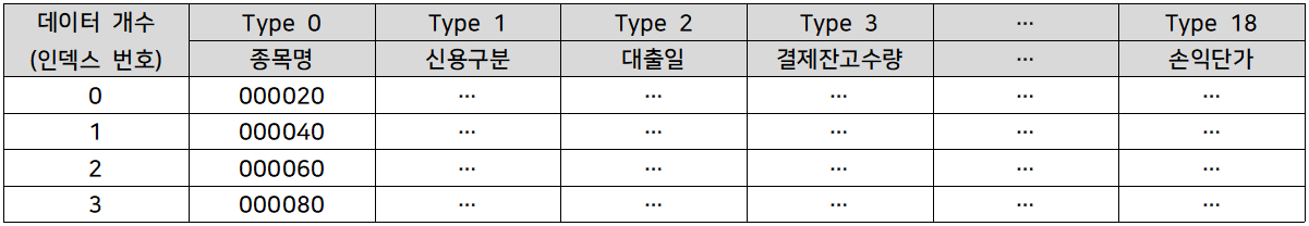 내용을 확인했다면 다시 본론으로 돌아와서, `Type`과 `Index`가 갖는 기능에 대해 알아보도록 하자. 이 두 가지 개념을 이해하기 위해서는 반드시 `Index`가 갖는 의미를 이해해야 한다. 여기서의 `Index`는 우리가 위에서 `GetHeaderValue(7)`을 통해 얻어왔던 데이터인 "수신 데이터 개수"를 의미하는데, 이 수신 데이터 개수는 곧 "보유 종목의 개수"를 의미한다. 다시 말해, 보유 종목별로 서버 내부에서 부여된 인덱스 번호가 있고 그 인덱스 번호 별로 `Type`에 해당하는 데이터를 요청하면 그 데이터를 확인할 수 있다는 것이다. 아래의 도식과 바로 아래에 있는 코드 예시를 통해 간단히 살펴보도록 하자.
