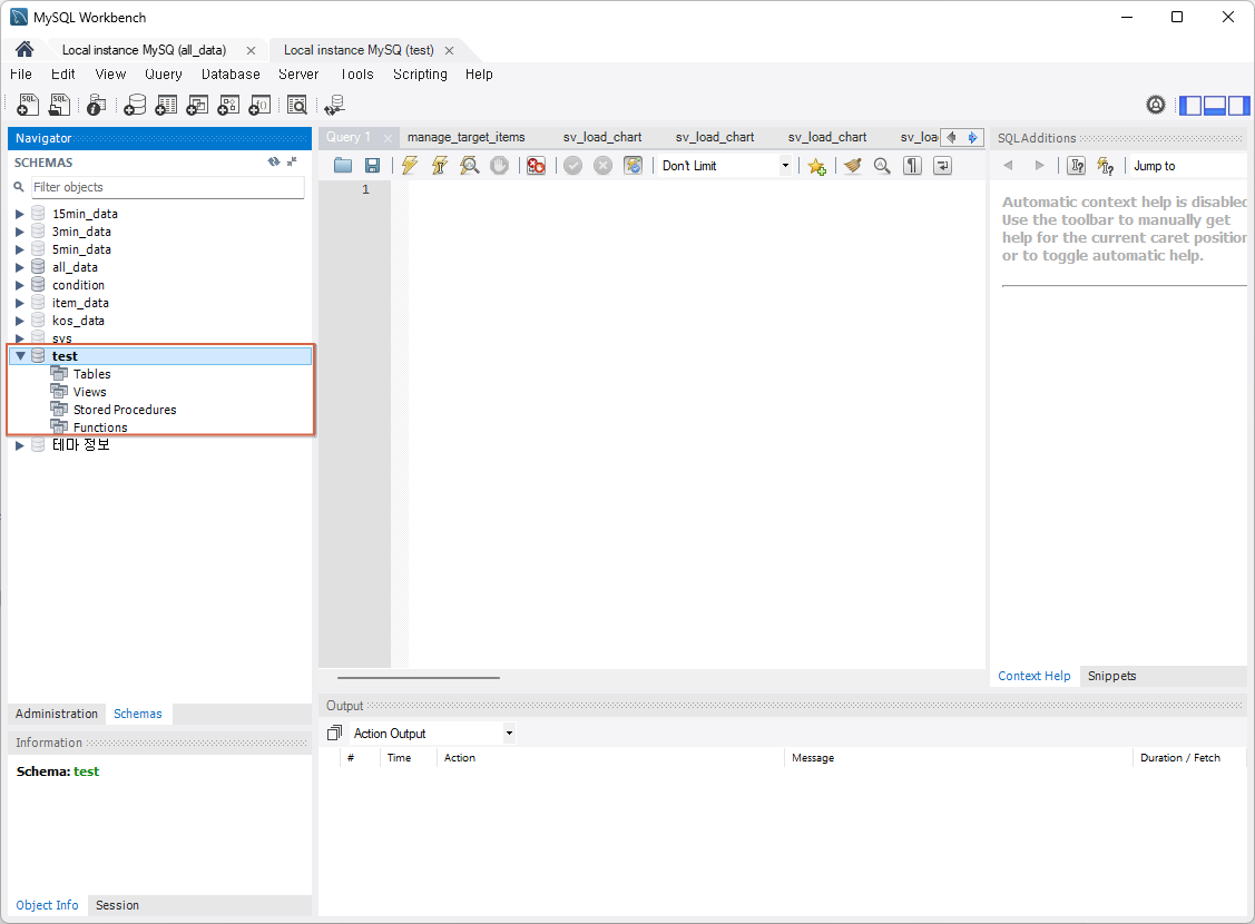 ▶ 실행 결과 확인하기(이미 생성되어 있는 상태임. 생성하는 과정을 보고싶다면 MySQL에서 test 데이터베이스 삭제)