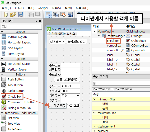 GUI에서 저장 여부를 결정할 수 있는 기능은 `QCheckBox`를 통해 간편하게 구현 가능하다. 즉, 이 체크박스가 체크되어 있으면 차트 데이터를 저장하고 체크되어 있지 않으면 저장하지 않도록 하는 기능을 구현하면 된다.