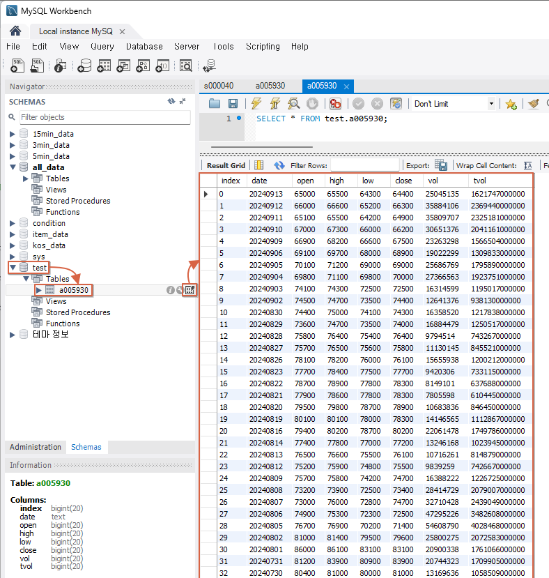 앞서 구현한 코드 상에서는 'day_data'라는 데이터베이스가 없으므로 차트 데이터를 저장할 수 없는 오류가 발생하니, 이전에 만들어두었던 'test'라는 데이터베이스에 해당 차트 데이터를 저장하도록 코드를 변경(_save_table 함수의 인자인 db_name에 전달해주었던 'day_data'를 'test'로 바꾸어주면 된다.)한 후 프로그램을 실행시켜서 차트 데이터를 조회해보면, 맨 아래의 이미지와 같이 'test' 데이터베이스 내에 'a005930'이라는 테이블 이름으로 하여 차트 데이터가 저장되었음을 확인할 수 있다.