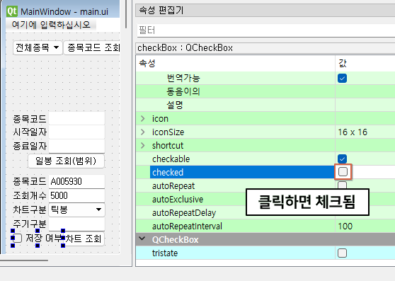 그건 아니다. GUI 파일 내부에서 아예 체크되어 있는 상태로 만들어버리면 되기 때문이다. Qt Designer 프로그램에서 체크박스를 클릭한 후, 우측의 속성 편집기 부분을 아래로 쭉 내려보면 checked라는 부분을 확인할 수 있는데, 그 부분을 활성화시킨 후에 저장하고 프로그램을 실행시켜보면 아예 체크박스가 체크되어 있는 상태로 시작된다는 것을 확인할 수 있다.