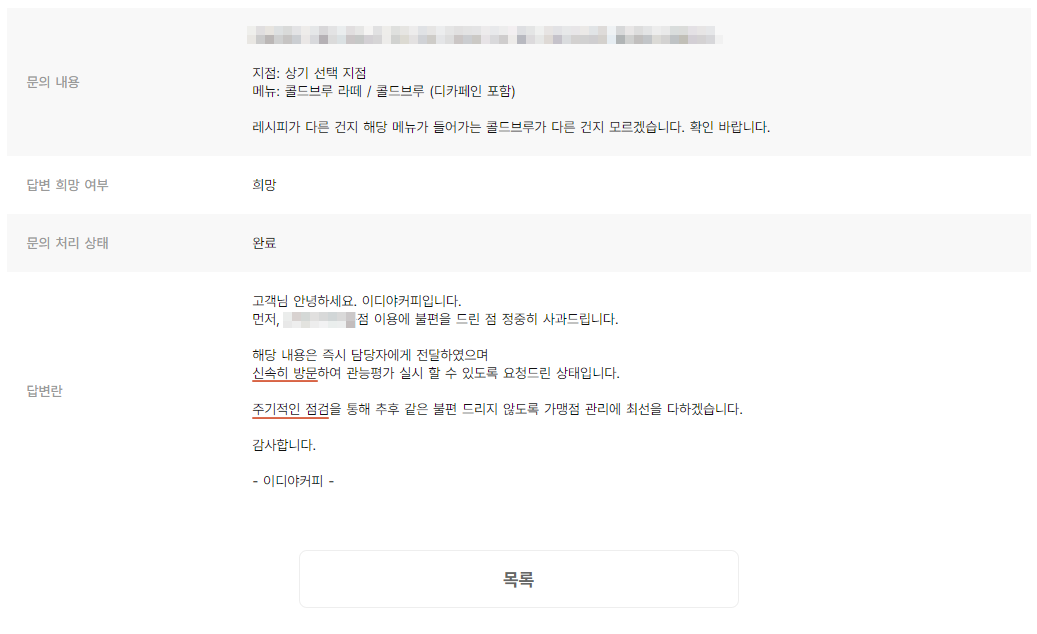해당 문의에 대한 답변은 담당자(아마 품질 관리 담당인 것으로 추정됨)에게 즉시 전달하였다고 하고, 신속히 방문하여 해당 메뉴를 점검하겠다는 내용이었다.