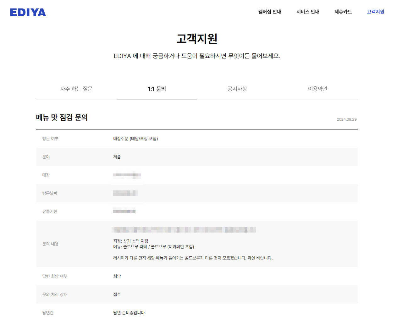 컴플레인을 넣는 방법은 단순하게, 이디야 홈페이지에 있는 [고객 지원] 메뉴의 1:1 문의 게시판을 사용하면 된다. 아래의 화면과 같이 문의 분야는 제품으로 선택하고, 매장과 방문 날짜를 선택한 후 불만이었던 점들을 써내려가기 시작했다. 근데 콜드브루 라떼를 마시는 건 사실 이 카페에서도 나밖에 없을 것 같아서, 다음에 왔을 때는 조금 껄끄러울 수도 있을 것 같았다. (문의 내용은 본사와 매장 점주까지 확인할 수 있다고 한다. 그래도 맛이 없는 걸 어떡해. 내가 아는 그 맛으로 돌아오길 바라는 마음 하나 뿐임)