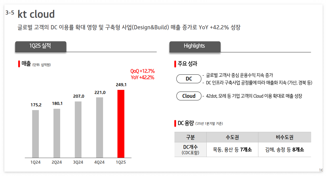 앞서 살펴봤던 SK의 경우만 봐도 어렵지 않게 알 수 있겠지만, 국내에서는 통신 3사가 데이터센터 구축에 열을 올리고 있는 상황이다. 통신사이니만큼 데이터센터를 구축하고 데이터를 송수신할 수 있는 망을 사용하여 인프라를 구축하는 데에는 자기네만큼 적합한 기업이 없다고 판단한 것 같다. (아마도 데이터센터를 통해 AI를 학습시키거나 하는 등의 서비스를 제공하고 구독료를 받아갈 수도 있을 것 같음) 그리하여 KT의 경우에는 AI/IT 매출 비중을 3배로 상승시키기 위해 본업을 혁신시키고 최고 수준의 AI와 클라우드 역량을 확보하기 위해 24년 6월 MS, 25년 3월 Palantir와 전략적 파트너십을 체결하였다. 뿐만 아니라 증가하는 AI 시장의 규모에 발맞추어 KT가 보유한 데이터센터를 바탕으로 kt cloud 사업을 통해 가상화 서버, GPU 서버, SSD 서버 등을 가지고 글로벌 고객을 대상으로 서비스를 제공하고 있으며, 데이터센터의 이용률과 매출액 모두 급격하게 증가(✅ YoY +42.2%)하고 있다. 더 나아가 25년 6월 현재 수도권 내 7개, 비수도권 8개 총 15개 데이터센터를 가지고 있으나 추후 2030년까지 경북에 10MW, 서울 가산에 40MW, 경기 부천에 80MW 규모의 데이터센터를 지속적으로 구축하겠다고 한다.