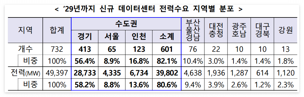 하지만 AI 인프라 중 데이터센터와 관련하여, 여러 기업들에서 AI 데이터센터를 구축하고 있지만 이와 함께 전력 생산량이 부족해지는 현상도 자연스럽게 따라올 수밖에 없다. 2023년 산업통상자원부의 보고서에 따르면 향후 AI와 빅데이터가 고성장 루트를 계속해서 밟을 경우 2029년에는 732개의 데이터센터 수요가 존재하며 이들의 소요 전력 용량은 49,397MW(49.4GW)가 될 것으로 예상된다고 한다. 이후 산업통상자원부는 2025년 2월, [제11차 전력수급기본계획]을 통해 2038년에는 데이터센터 전력 수요가 6.2GW에 해당할 것으로 보았는데 이는 단순히 정부가 바라보는 전력망 수용 가능 수준으로 보는 게 적절하다고 보인다. 물론 2038년까지 3기의 원자력발전소를 짓고 2035년부터는 소형모듈원자로(SMR)의 실용화를 통해 추가적인 전력을 보충하겠다고 하긴 하지만, 데이터센터의 전력 소비량을 감당해내기에는 현실적으로 어려워보인다.