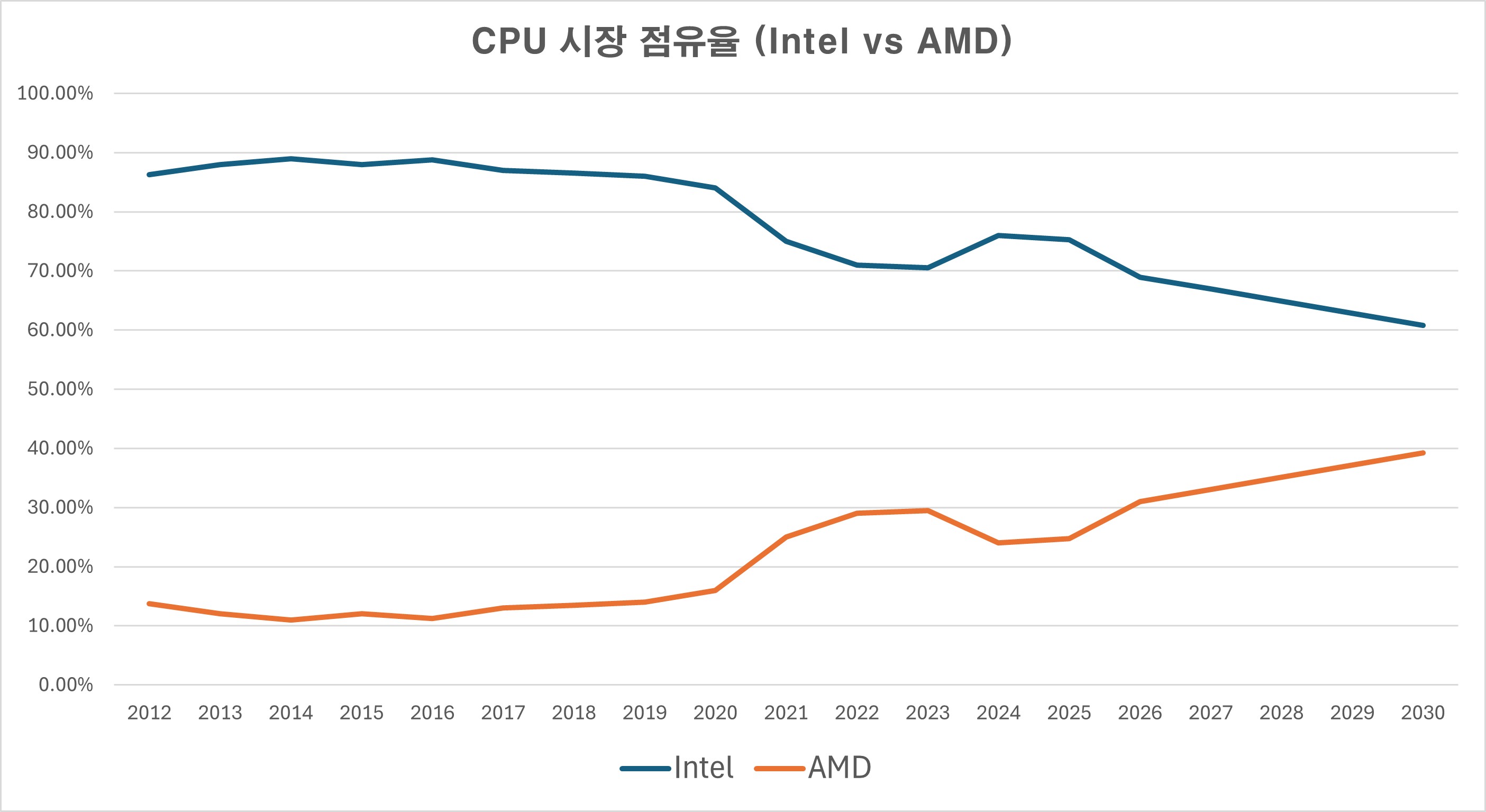AMD는 지금의 엔비디아가 독점 체제를 유지하고 있는 AI GPU 시장에 진입하기 전에, ✅ CPU 시장에 먼저 진입하기 위해 다방면으로 노력해왔다. 수많은 사람들이 알고 있듯이, CPU 시장에서는 Intel 가장 높은 점유율을 가지고 있었으며 2014년에는 약 89%의 점유율을 보여줄 정도로 지금의 엔비디아와 비교하여 결코 밀리지 않는 높은 점유율을 자랑하고 있었다. 하지만 2020년을 기점으로 인텔의 데스크탑 CPU 점유율은 70%로 하락하기 시작했고 이후 2030년에는 60%까지 하락할 것으로 전망하고 있다.