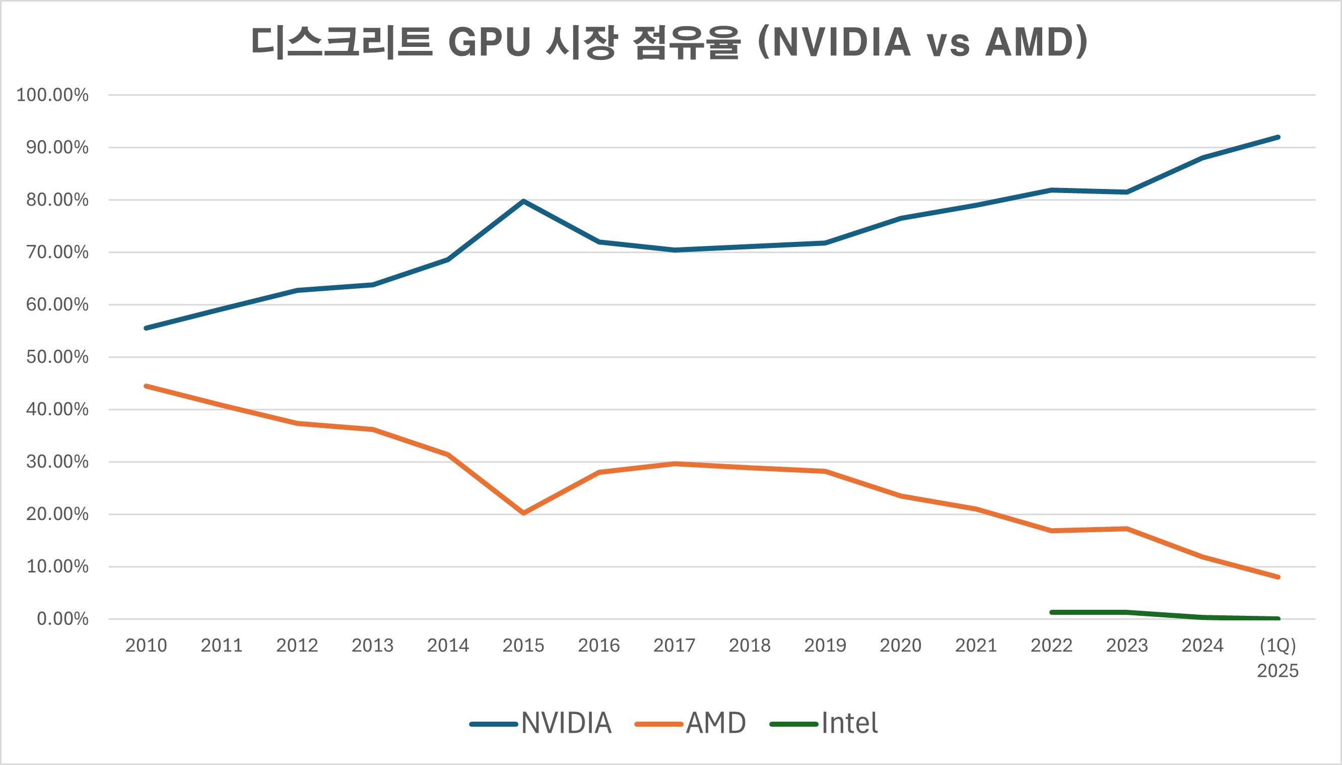 엔비디아는 외장 GPU 시장 점유율을 계속해서 늘려가더니 2025년 1분기에는 결국 92%의 독보적인 점유율을 차지하며, AMD의 라데온은 인텔의 아크처럼 아예 시장에서 쫓겨나는 듯한 형국이 펼쳐졌다.