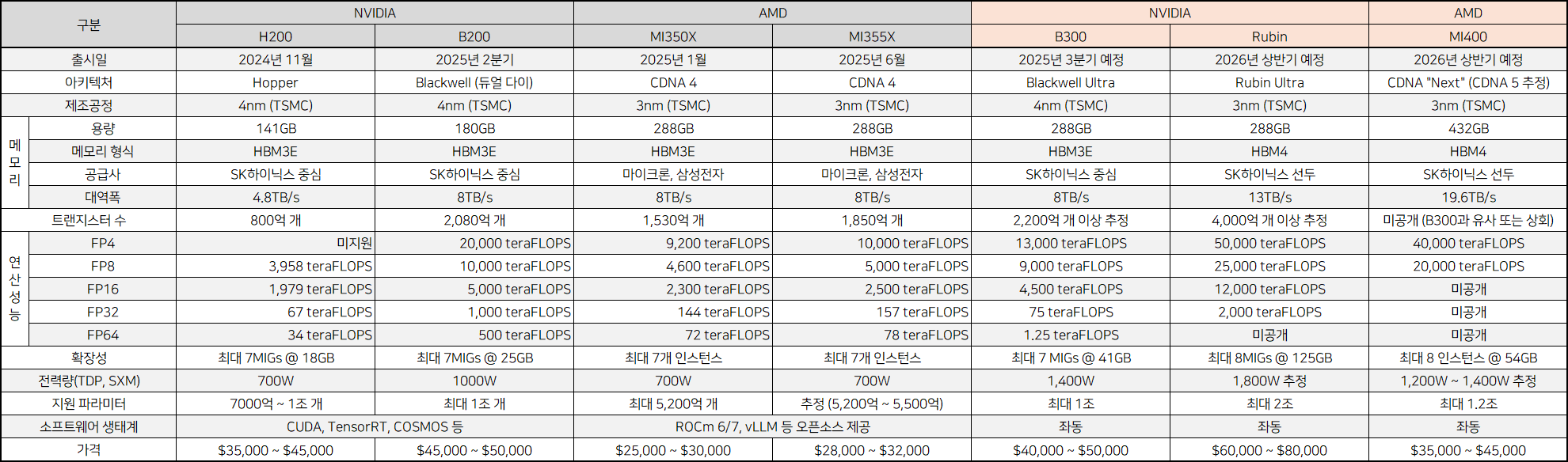 현 시점 AMD와 엔비디아의 제품 비교(미출시 제품은 추정 데이터)